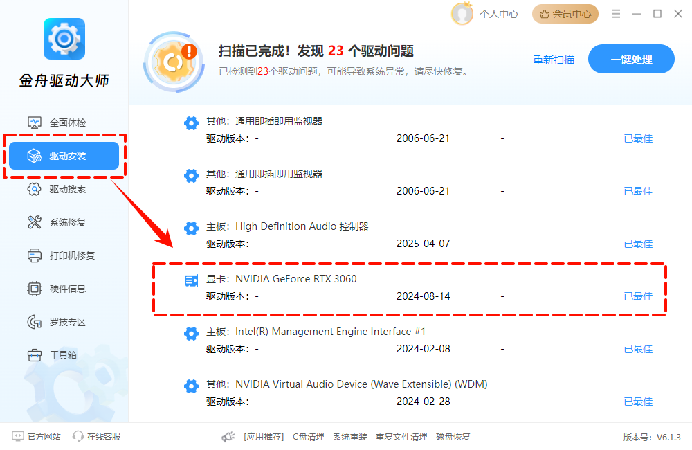 除了系统更新显卡驱动,我们还可以通过金舟驱动大师,一键扫描管理电脑深层次问题,帮助我们快速完成电脑驱动安装修复。
