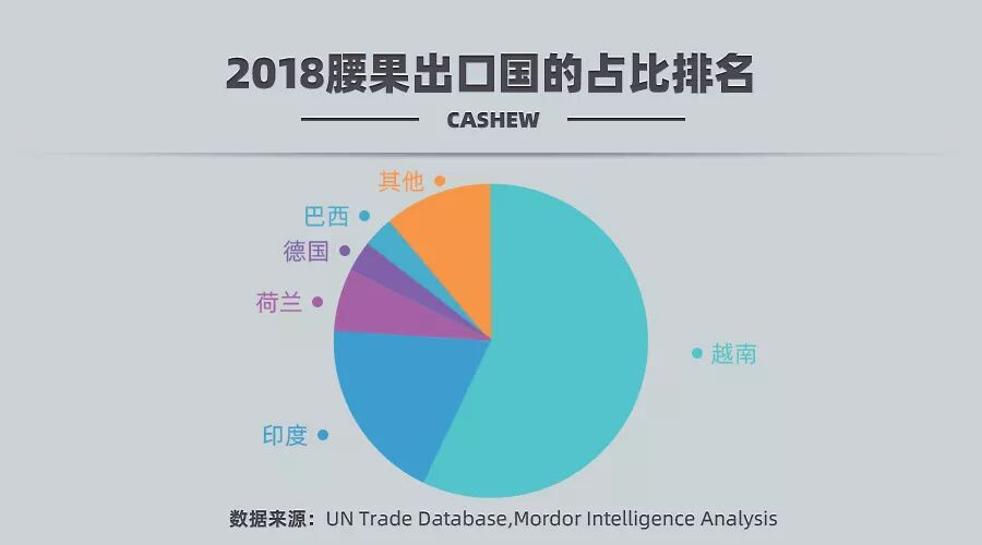 非洲目前以原始形式出口约95%的腰果。在2019-2024年的预测期内,非洲腰果市场的产量预计将以4.5%的复合年增长率增长。科特瓦迪的国家最高产量超过35%,其次是贝宁,坦桑尼亚和几内亚比绍,分别为11%,10%和9%。而科特瓦迪的出口占36%。坦桑尼亚的腰果产业占该国出口收入的5%,每年约7,000万美元来自原料腰果出口。而大部分非洲的生腰果产品都出口到印度加工。