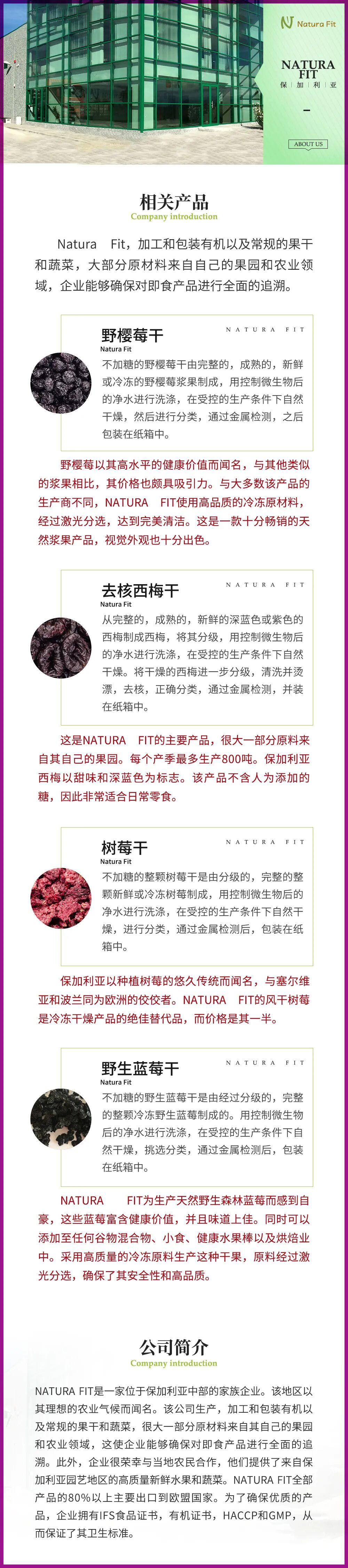 Natura Fit是一家位于保加利亚中部的家族企业,该地区以其理想的农业气候而闻名。该公司生产、加工和包装有机以及常规的果干和蔬菜,很大一部分原材料来自其自己的果园和农业领域,这使企业能够确保对即食产品进行全面的追溯。此外,企业很荣幸与当地农民合作,他们提供了来自保加利亚园艺地区的高质量新鲜水果和蔬菜,Natura Fit全部产品的80%以上主要出口到欧盟国家,为了确保优质的产品,企业拥有IFS食品证书,有机证书,HACCP和GMP,从而保证了其卫生标准。