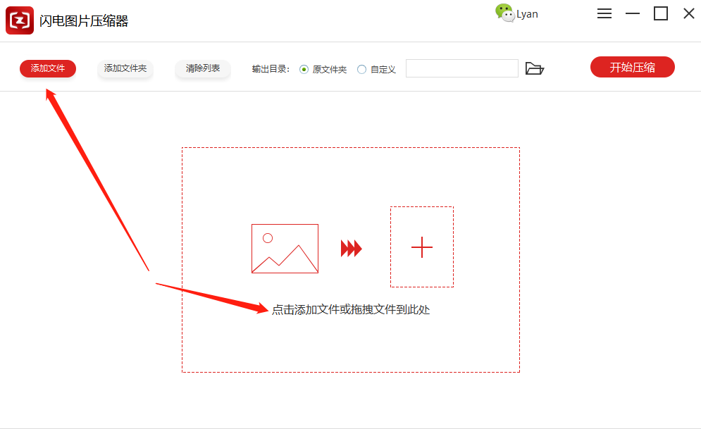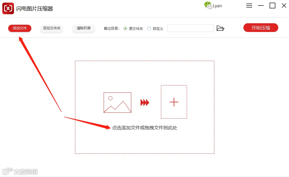 在软件的左侧,我们选择“添加文件”,将需要压缩的图片上传到这里,可以同时添加多个图片哦!或者直接将图片拖到指定框内。