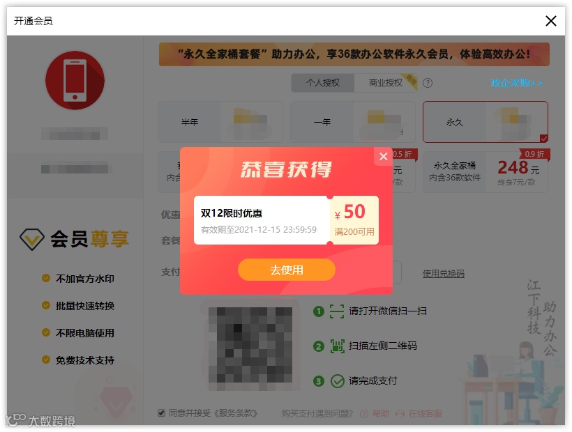 优惠券领取方式:电脑上打开任意软件,登录后点击“开通会员”得到以下领取页面,点击“去使用”购买永久全家桶即可;