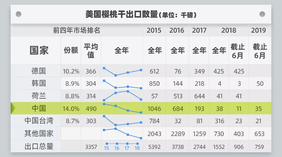 由于年初的天气比较差,雨量大,所以产出的时间推迟。美国樱桃的产量正常,但数据显示美国出口中国的量下降。主要由于中国提高了关税的价格,同时将进口的目标转向其他国家。