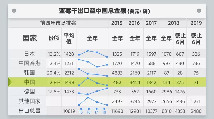 2018年中美贸易战开打以后美国出口到中国的蓝莓产量及产额都明显下滑,在出口单价的部分涨幅最大的就是种植蓝莓干,从2015年平均每磅2.04美元涨到2019年每磅4.35美元。可以说中美贸易战对蓝莓的进出口贸易影响是很大的。