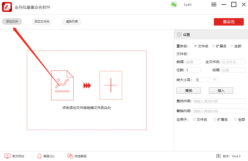 第一步、打开软件后,点击“添加文件”,然后将需要重命名的所有文件上传到软件中。