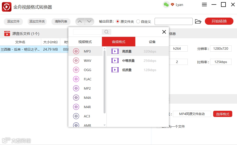第三步、在这里,我们选择【音频格式】为MP3格式,大家可根据自己的需要选择。