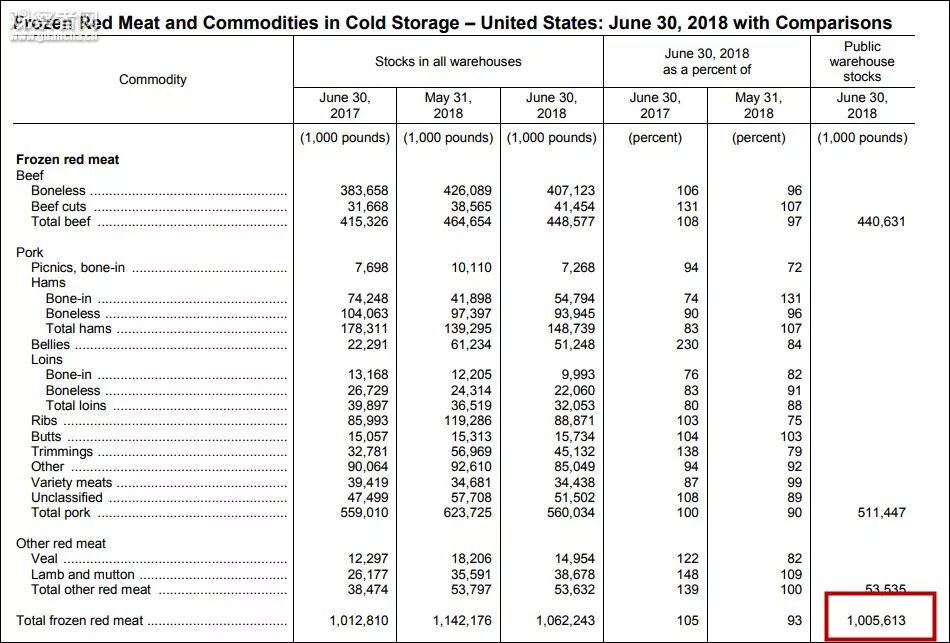 仓库冷藏红肉总量约为10亿磅(约合9亿斤)。较上月下降7%,但较去年仍增长5%。其中,猪腩虽然较5月下降16%,却比去年多了130%。