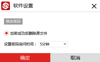 软件设置:在这里可选择加密后的文件是否保留原文件以及设置密码询问时间(时间段内所加密的文件都是同一个密码)。