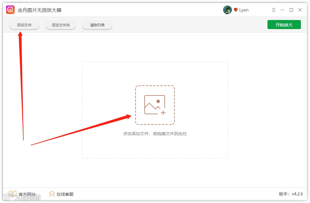 第一步、在电脑中打开软件,然后选择添加图片进行放大处理,添加图片有两种方式:一种是点击添加文件或者文件夹,另一种是直接点击界面中间的“+”键选择添加
