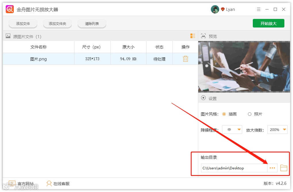 第二步、成功上传图片后,在软件的右下方设置图片风格、降噪程度以及放大倍数