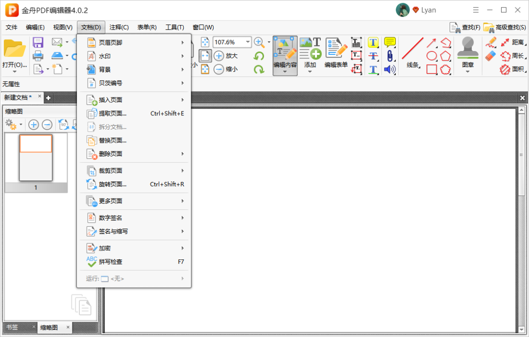 点击文档选项,可选择给文档添加水印、背景、编码、页眉页脚,以及插入新的空白页等操作;