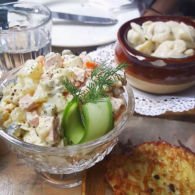 在世界各地被称为俄罗斯沙拉。Olivier是Lucien Olivier在19世纪60年代发明的马铃薯沙拉的变体,原来的配方丢失了,据说是用鱼子酱、松鸡、烟熏鸭、小牛肉舌做成的,并有自己的秘密调味汁。现在我们吃到的常常是注入蛋黄酱的奥利维耶沙拉,配料很简单:煮土豆、胡萝卜、鸡蛋、豌豆、咸菜和煮鸡肉或者牛肉。或许正因为简单而又美味,这种沙拉对俄罗斯人来说成了最好的安慰食物,也常常会在重要的节假日食用。