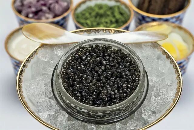 鱼子酱又名盐腌鱼卵,是俄罗斯的美味、奢侈生活方式的代名词,在各行各业的俄罗斯人中非常受欢迎。它是用小锡罐或按斤两在商店里设置的一个巨大的桶中出售的。红鱼子酱具有不寻常的质地,有非常明显的咸味(有些人也觉得它很腥),并且是油性的,使其成为完美的传播。俄罗斯人用新鲜的白面包(通常加上黄油)或自制的薄煎饼(鲜嫩)配上新鲜的浓酸奶油(斯美塔那)来吃。在俄罗斯鱼子酱非常便宜,以至于你会在任何聚餐场所都能看到鱼子酱的身影,因此有人说,有鱼子酱的地方就一定有俄罗斯派对。