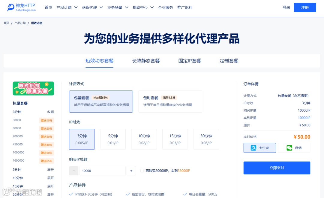按个数售卖,包时计费,适用于IP需求量不大,追求极高稳定性的个人/企业用户,限时折扣活动优惠力度空前!