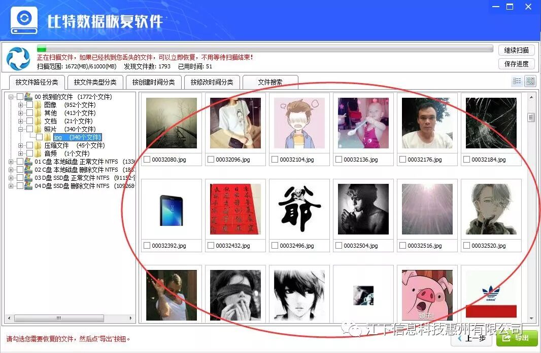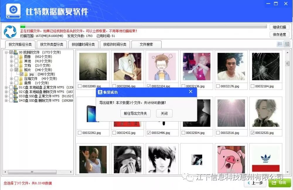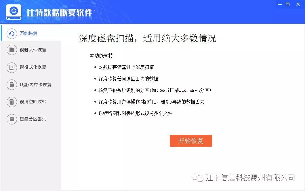 比特数据恢复软件是由江下信息科技(惠州)有限公司开发并独家发行的一款全能的数据恢复软件,可以有效解决各种硬件、软件或人为误操作引起的文件、数据丢失问题!比如:误删除文件、误格式化分区、误分区、文件不能复制、分区打不开、提示RAW等。支持硬盘、U盘、内存卡等多种设备;支持FAT16、FAT32、NTFS、exFat等多种文件系统;完美兼容全线Windows系统;操作简单,扫描速度极快,恢复效果极好!边扫描边显示,随时可以恢复找到的数据,不用等扫描完成。