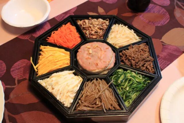 韩国的祭祀也是很有意义的事情,韩国人十分讲究祭礼食品,提前准备好食品是在节日里祭奠祖先的大事。其中,祭礼用的糕点不能用耀眼的色彩,所以用红豆泥的时候要去皮。另外,我们在古装韩剧中经常可以看到宫廷餐中有一款很精美的饮食-九折饭。九折饭,顾名思义由9种材料构成,但由于形态漂亮、做工精美而让人不忍吃。现在大时节或喜庆时韩国人都还要吃九折饭。