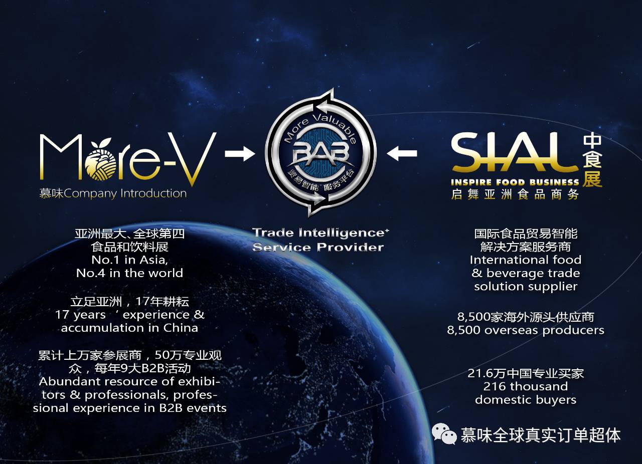 More-V中食展BAB服务平台是More-V(慕味)公司与中食展在建立战略合作伙伴关系的基础上通过双方努力共同完成的一个项目。这个项目的亮点是结合中食展和More-V专注于进口食品贸易的优势,不仅能将3天的展会服务延展为一年365天,而且能以More-V BAB模式和数据化智能采购完成销售促进和解决方案的提供,达成持续参加中食展获取服务增值的目的。