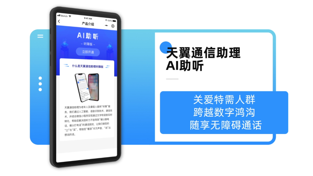 天翼通信助理AI助听,是一款以人工智能、语音识别和通信技术为基础打造的微信小程序产品。通过实现语音-文字自由无障碍转换,专为听障人群和耳背老人等群体提供无障碍AI通话服务,满足其接、打电话,与人沟通的基本需求。
