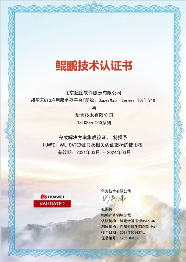3月27日,超图云GIS应用服务器平台获2021年首个鲲鹏Validated认证。超图软件联合麒麟软件、海量数据库、东方通等合作伙伴在四川鲲鹏生态创新中心,经过2个多月紧密协作,对超图云GIS应用和鲲鹏服务器进行了全面适配和深度优化,该方案在二维业务场景下比业界主流水平性能最高提升76%。