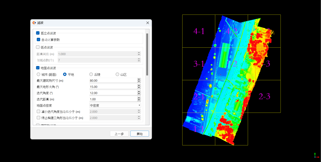 选择测区地形,用CoProcess内置自适应地面点滤波算法,进行地面点自动滤波。