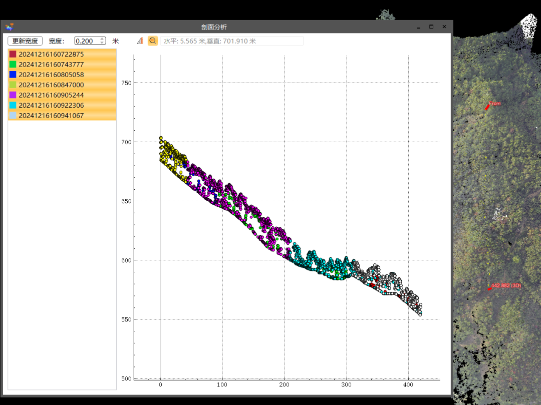 从峡谷植被茂密处剖面图可以看出,地面点连续且密集,点云穿透植被效果良好。