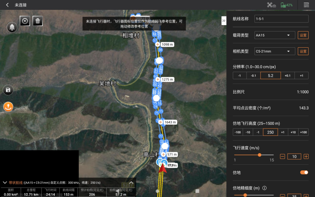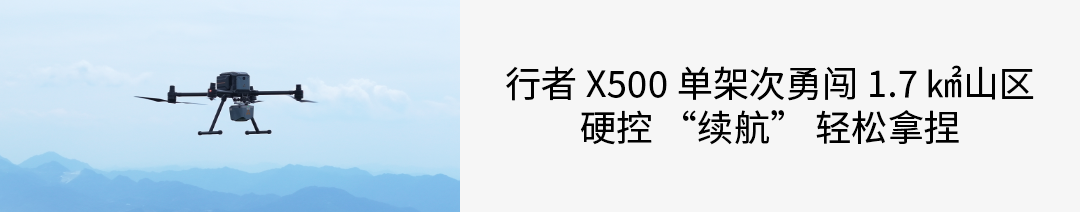 使用行者X500搭载AA15进行大高差山区数据采集,单架次完成5-6公里数据采集,外业效率较其他无人机设备提升3倍,减少外业工作时长。