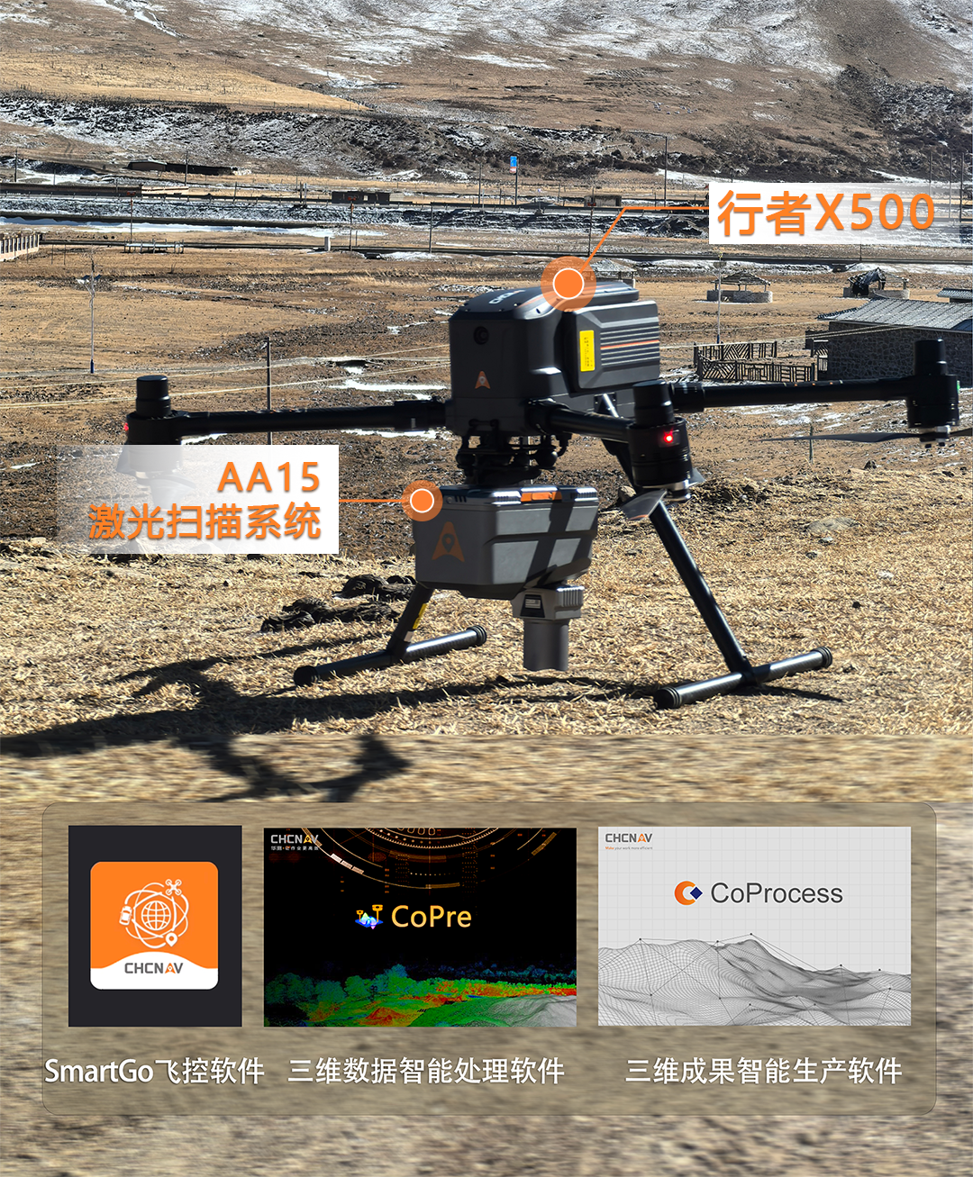 一体化方案由行者X500无人机、AA15激光扫描系统、C5正射摄影测量系统、CoPre三维数据智能解算软件、CoProcess三维数据成果智能生产软件构成,软硬件高效协同作业,可快速生成高精度真彩色点云、DOM、DEM、等高线等丰富数据成果,为电力勘察地形成图、优化选线设计提供多源数据支持。