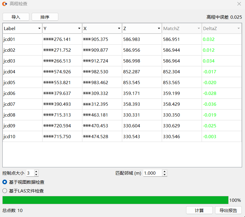 为了验证点云成果的精度,我们实地采集了10个检查点与成果数据进行比对,得出高程精度中误差为2.5公分。