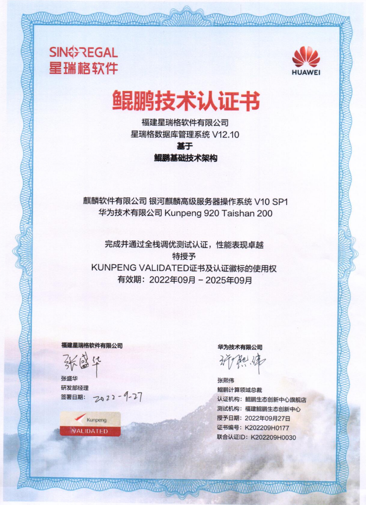 近日,福建星瑞格软件有限公司(以下简称星瑞格)的星瑞格数据库管理系统解决方案获得鲲鹏Validated认证。星瑞格联合福建鲲鹏生态创新中心基于银河麒麟高级服务器操作系统V10、鲲鹏Boostkit、毕昇JDK对星瑞格数据库管理系统解决方案进行全栈调优和性能优化,从兼容性、稳定性、安全、功耗、业务功能、基础性能和业务性能这七个维度进行了Validated联合测试,在tpmc场景,性能提升11.25%,实现星瑞格数据库管理系统在鲲鹏底座中更稳定、更安全、更高效运行。