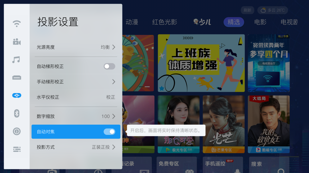 自动对焦:只需要打开投影设置中的自动对焦即可,坚果J10已升级为实时无感对焦,放下即清晰。