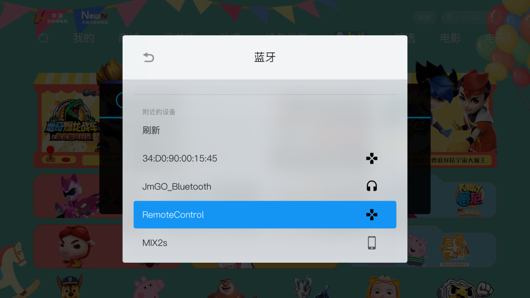 同时长按遥控器的快捷中心键和设置键直至指示灯闪烁,在设置里面找到蓝牙,选择蓝牙连接,点击刷新,扫描设备,再选择“Remote Control”,页面显示已连接,遥控器指示灯长亮即可。