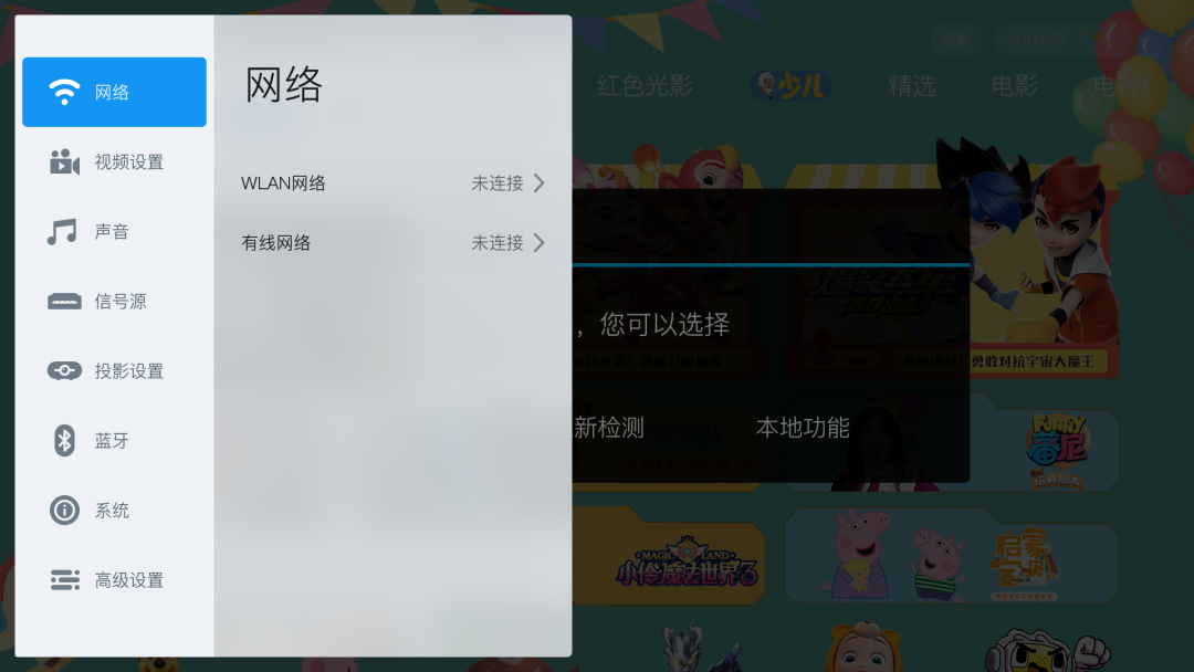 手机连接WiFi,在投影仪的"我的"里面找到"设置",选择"网络设置"的"WLAN网络",再点击连接手机同一wifi。