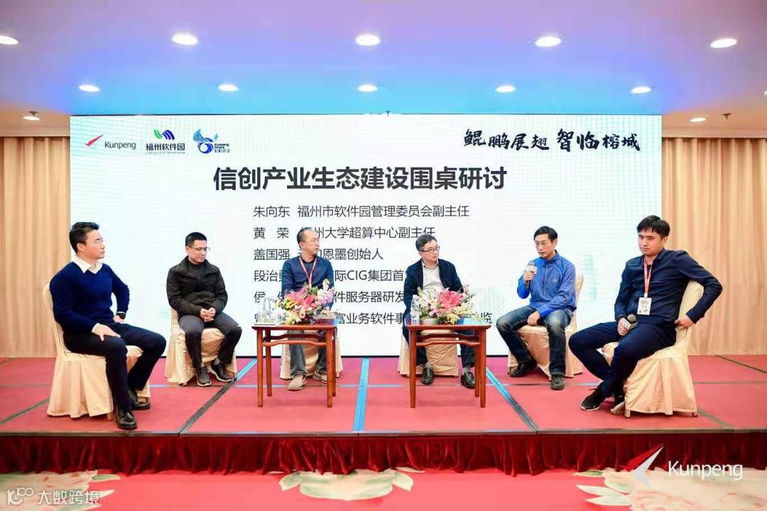 在最后的信创产业生态建设圆桌论坛上,福州市软件园管理委员会副主任朱向东 ,福州大学超算中心副主任黄荣、云和恩墨创始人/ACDU主席盖国强、中软国际CIG集团首席架构师段治勇、麒麟软件服务器研发部技术总监侯建和中电福富业务软件事业部高级副总监曾嗥共同探讨信创产业的新机遇与挑战。