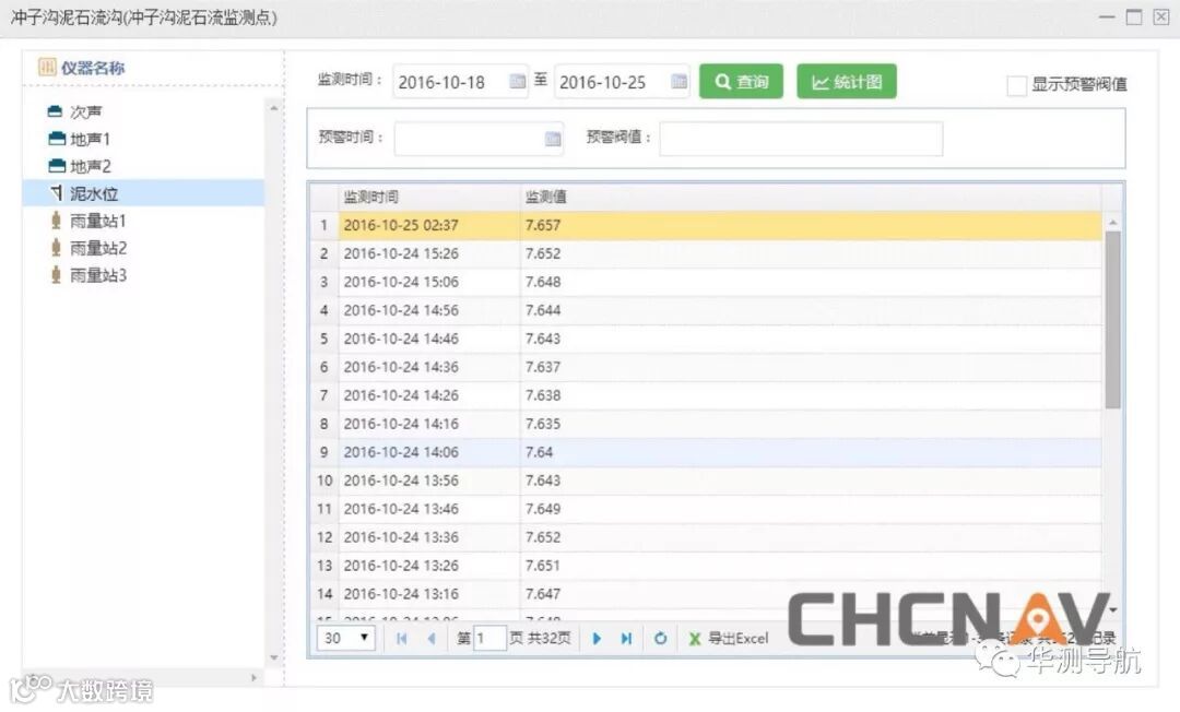 雨量数据采集在平台中可查询和显示30分钟、1小时、3小时、6小时、12小时和24小时以及相邻多天的降雨量信息。