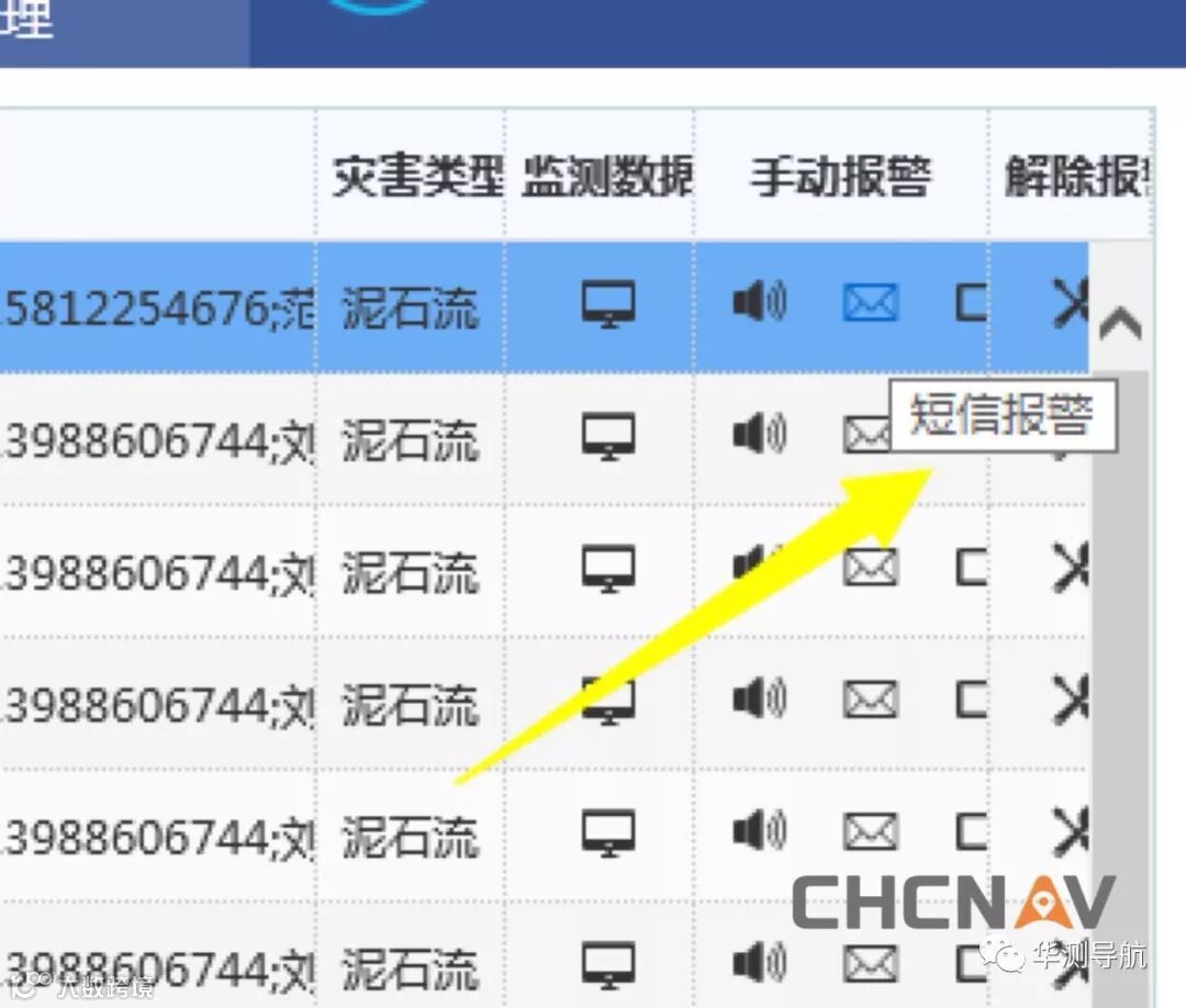 监测数据达到一定的阈值时,原本设置好预警短信信息会自动发送给事先添加好的预警电话号码,通过短信的方式通知地方政府、危险区村民以达到监测预警的目的。