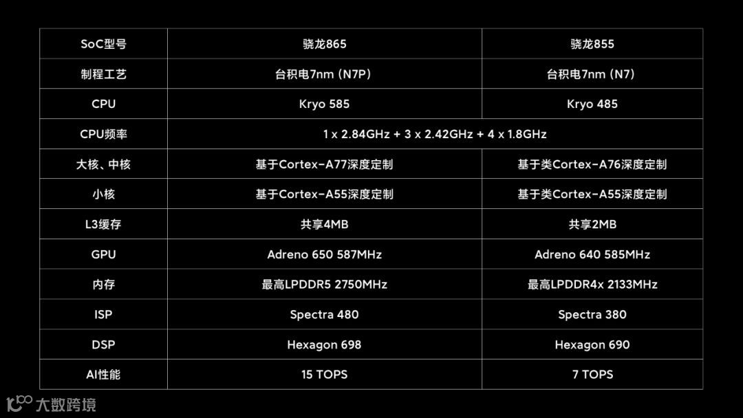 首先我们看一下骁龙865在核心参数上和骁龙855的区别。
