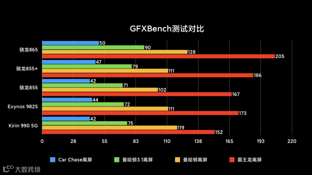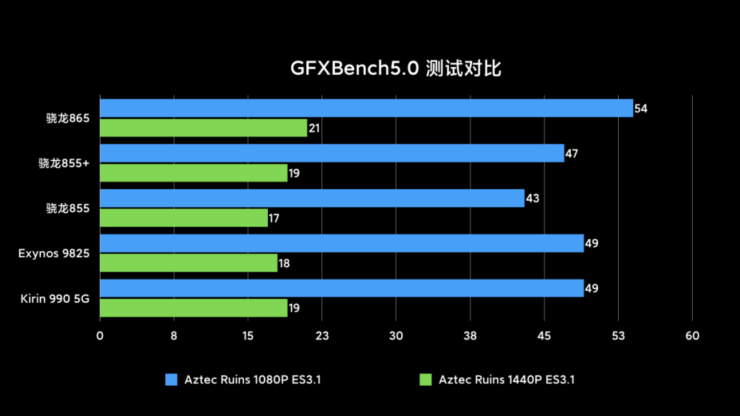 而到了压力更大的GFXBench 5.0测试场景,情况和上面几个旧场景类似,骁龙865同样可以称霸Android阵营。