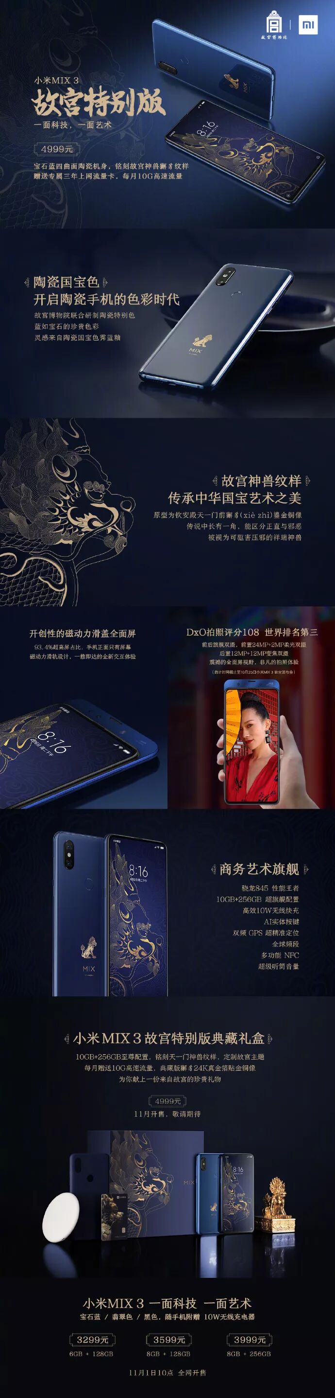一面科技,一面艺术。小米MIX3故宫特别版典藏礼盒,专享10GB至尊内存配置,内含獬豸24K贴金铜像、10W无线充电器和专属小米移动流量卡。