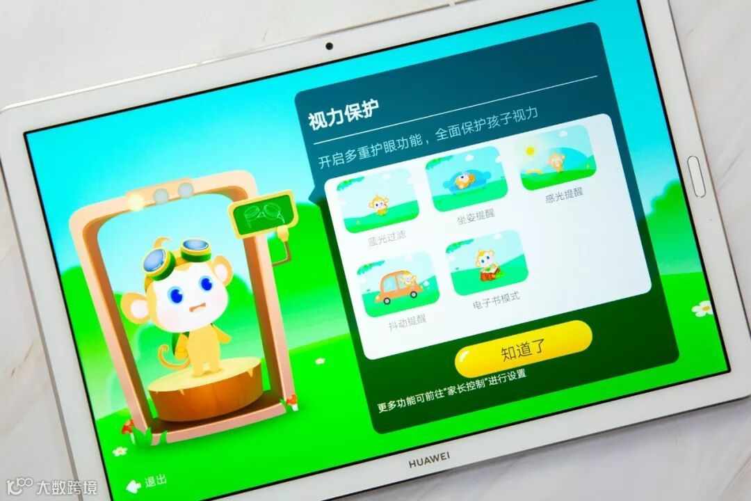 此外,华为平板M6还针对蓝光、小朋友的坐姿、外观环境是否过亮或过暗、是否边走动边使用等情况,做出了相应的提醒、调整、限制,以此来保护他们的眼睛。
