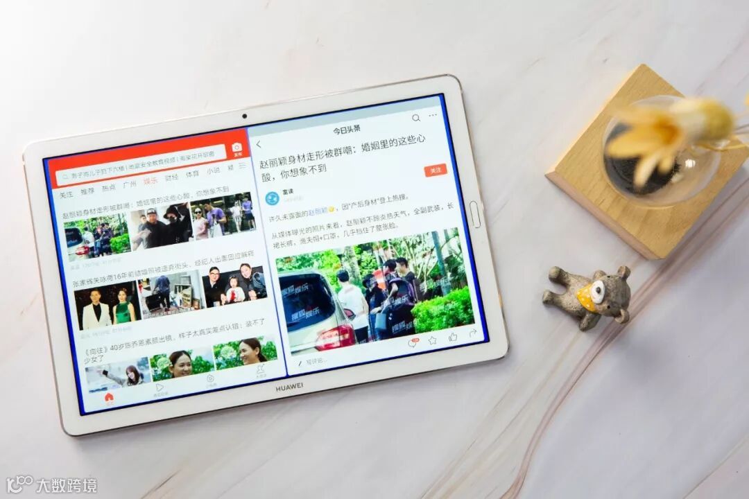 在华为平板M6上,当你打开「平行视界」功能后,一切就不一样了。同样的今日头条,随便点一条资讯,你会发现它变成双屏显示了。
