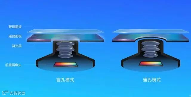 如图所示,通孔屏技术是将屏幕背光层、液晶面板全部打穿,玻璃盖板覆盖在摄像头上。而盲孔则是将屏幕背光层打穿,液晶面板和玻璃盖板完整覆盖在摄像头上。