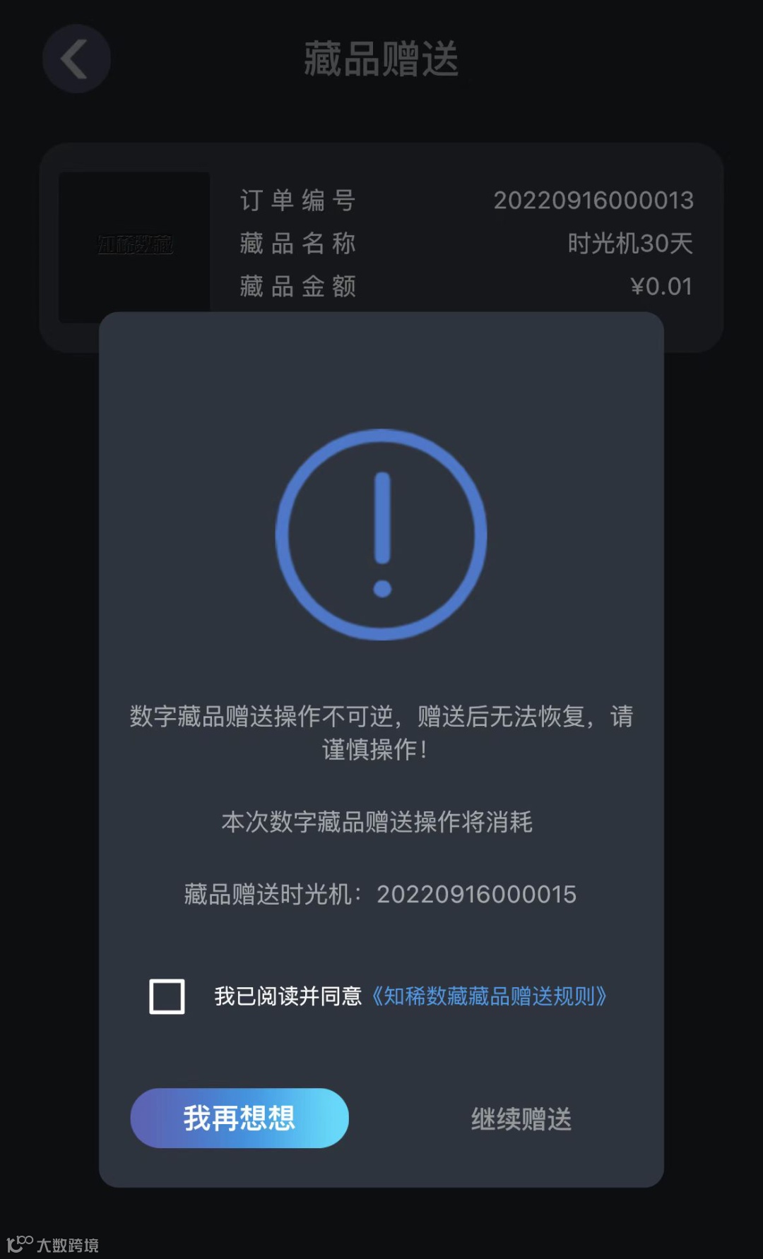 4,知稀数藏时光机权益为购买特定数字藏品赠送的权益,如原数字藏品发生赠送操作,此时光机权益将随同原藏品共同转移;如时光机权益已使用,在原藏品转移后也不可再次使用。