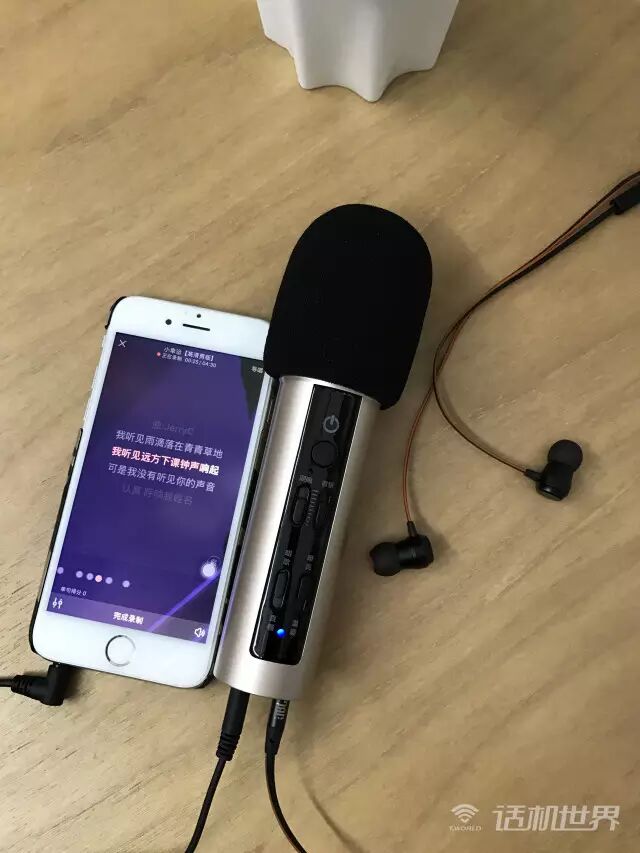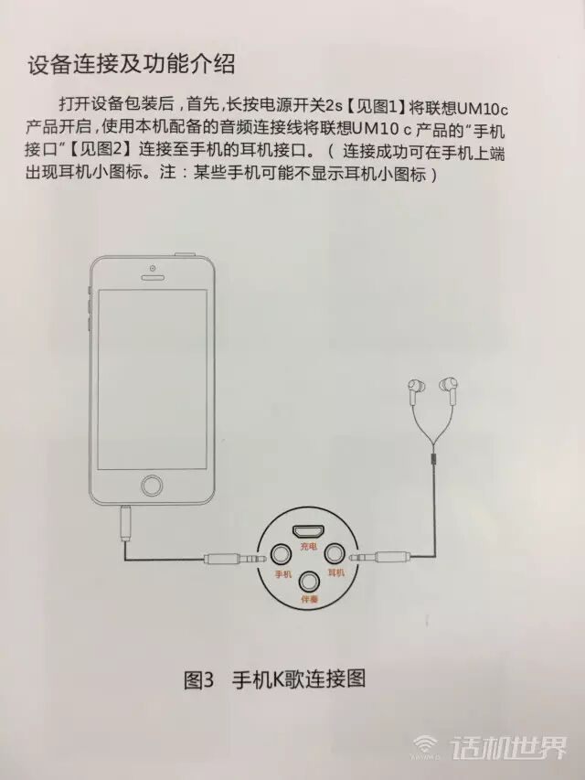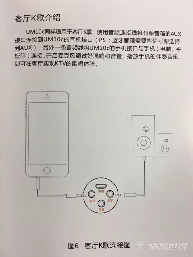 由于场景限制,这边就试一下手机K歌。根据说明书介绍,我们连接好手机插口和耳机插口。