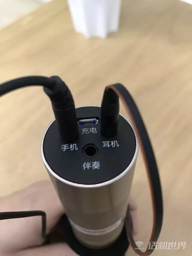机身底部是四个接口,分别微Micro USB接口、手机接口、耳机3.5mm接口和伴奏接口,间隙距离比较大,所有接口插满都不会相互影响。