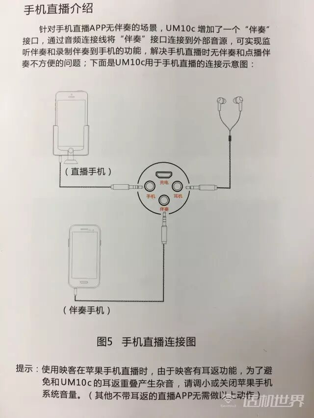 手机直播:连接手机插口、伴奏插口和耳机插口(两个音频线+一个耳机);