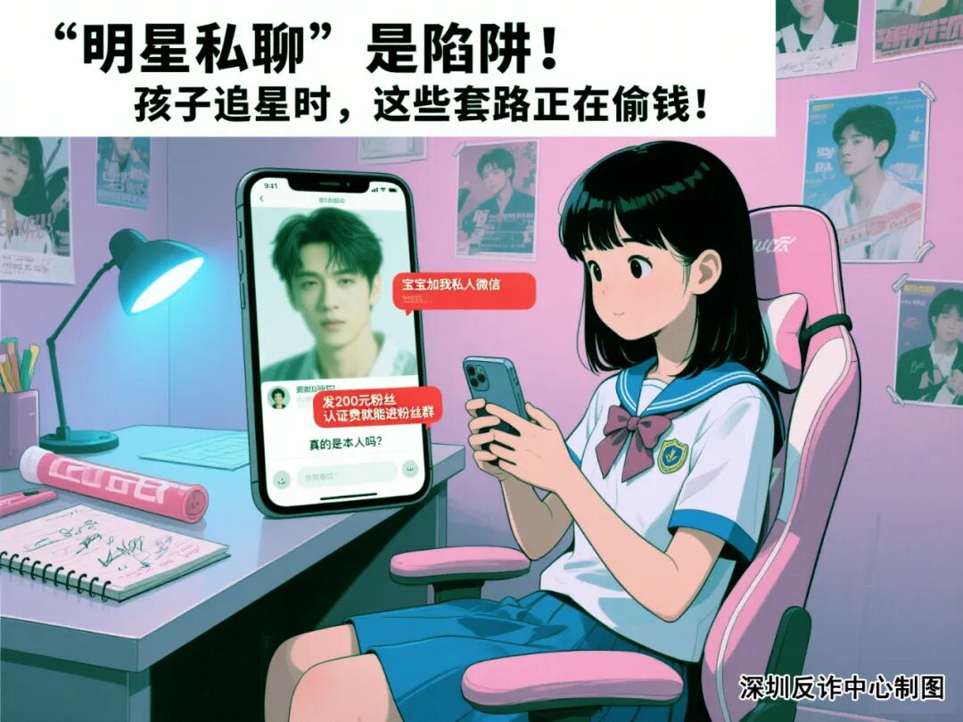 爱豆私聊是陷阱,理性追星莫沉迷。涉及转账先停手,陌生链接勿点击。遇到情况告父母,反诈防骗要牢记。