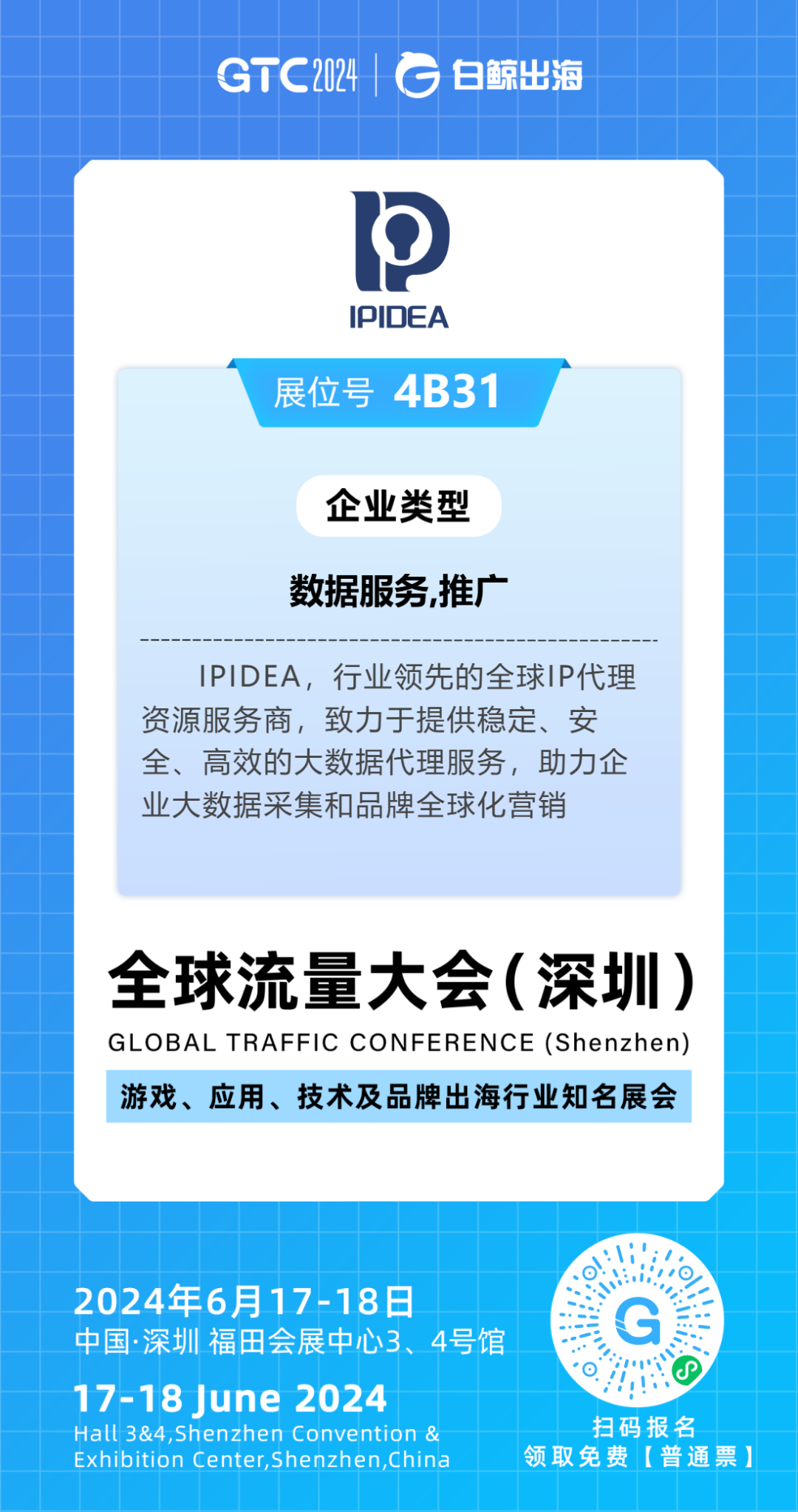 作为业内领先的IP代理资源服务商,IPIDEA荣幸受邀出席此次展会,将与业界同仁共同探讨出海新趋势,共话未来发展。IPIDEA凭借全球220+国家和地区的亿级动、静态住宅代理资源,为全球100万+企业与用户提供稳定、安全、高效的大数据代理服务,成为企业出海征程中的坚实后盾。