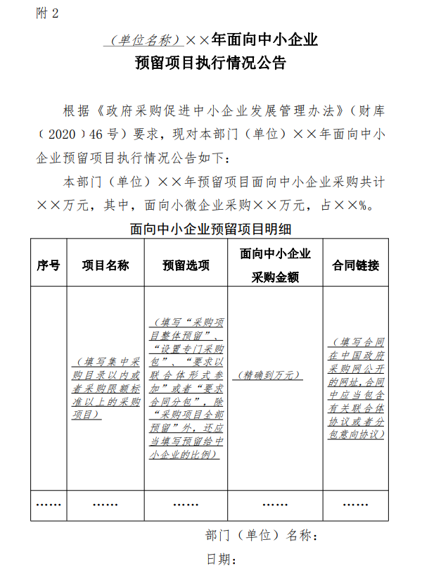 第十八条 主管预算单位应当自2022 年起向同级财政部门报告本部门上一年度面向中小企业预留份额和采购的具体情况,并在中国政府采购网公开预留项目执行情况(附2)。未达到本办法规定的预留份额比例的,应当作出说明。