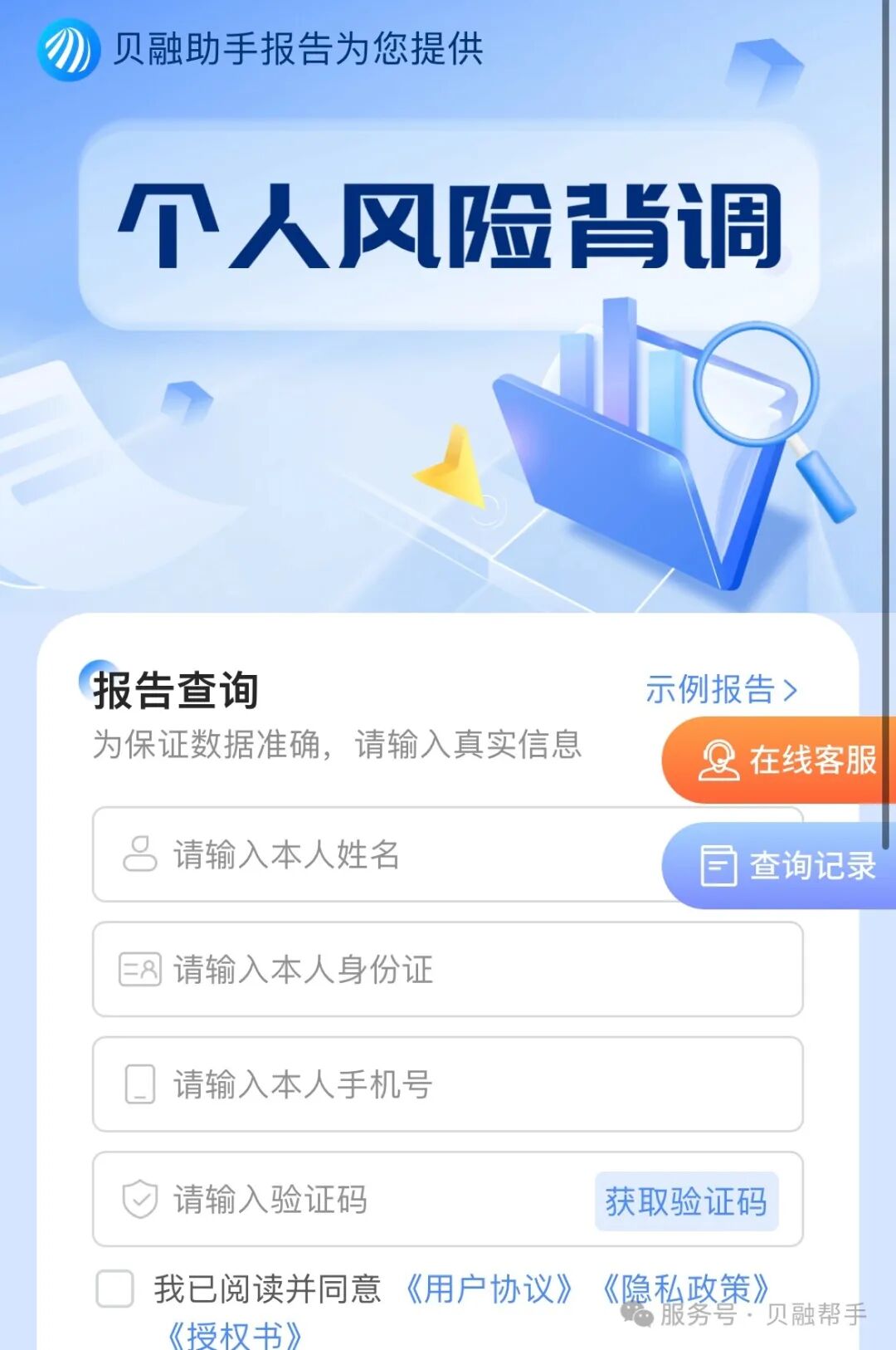 贝融助手提供的查询内容全面,涵盖了个人风险数据报告查询、失信风险、消费记录违约、失信黑名单、不良记录等。此外,贝融助手还提供个人数据报告查询,适用于消费申请、租赁、招聘、婚恋等诚信认证场景。