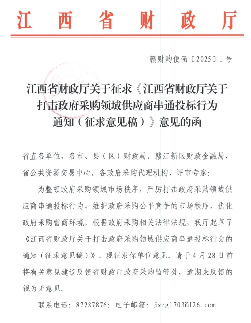 4月11日,江西省财政厅关于征求《江西省财政厅关于打击政府采购领域供应商串通投标行为的通知(征求意见稿)》(以下简称《征求意见稿》)意见的公告,意见反馈截止时间至2025年4月28日。