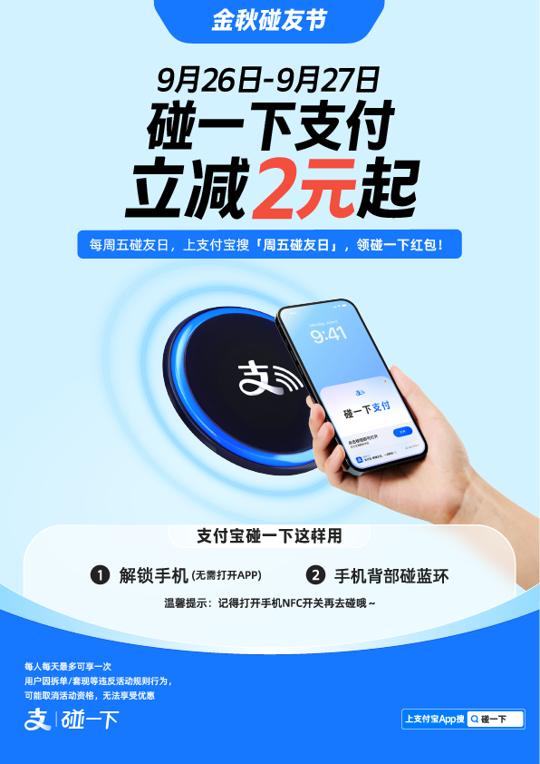 金秋时节,支付宝“碰一下”带来惊喜福利,9月26日至27日全国范围内支付立减2元,轻松享受便捷支付与优惠双重体验!让全国消费者都感受到“碰一下”的魅力。